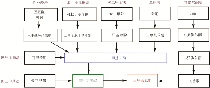 ... 叔丁基苯酚法于2012年底由能特科技有限公司(以下简称“能特科技”)开发.该法是由叔丁基苯酚和甲醇为原料,以铁氧化物为催化剂,得到2,6-二甲基-4-叔丁基苯酚,再与甲醇反应,以氧化铝为催化剂合成2,3,6-三甲基-4-叔丁基苯酚,然后经硫酸脱掉叔丁基后精馏得到三甲基苯酚[33],然后合成三甲基氢醌.该法采用了较为易得的叔丁基苯酚为原料,缓解了间甲苯酚原料紧缺的情况.同年,能特科技开发了苯酚法.该法是由苯酚与甲醇发生甲基化反应产生2,6-二甲基苯酚,再经磺化、酯化、傅克烷基化、脱磺酸基等反应,生成三甲基氢醌[34].该方法也绕过了间甲苯酚的原料紧缺问题,提供了另一种可行方案. ...