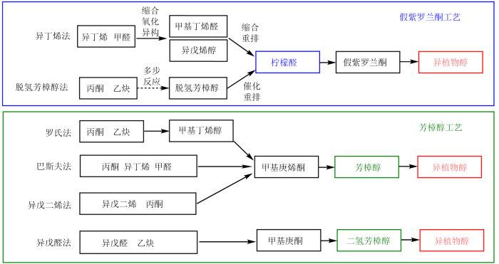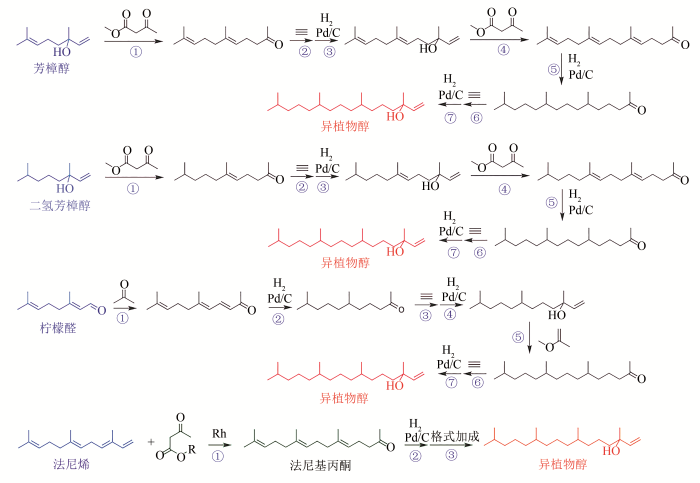 ... 芳樟醇工艺是目前全球绝大多数异植物醇制备所采用的工艺,该工艺主要包括罗氏法、巴斯夫法、异戊二烯法、异戊醛法等.罗氏法以乙炔和丙酮为原料合成2-甲基-3-丁烯-2-醇(甲基丁烯醇),再经过加碳及氧化获得6-甲基-5-庚烯-2-酮(甲基庚烯酮);巴斯夫法以丙酮、异丁烯、甲醛为原料,在高温高压下一步合成6-甲基-6-庚烯-2-酮,它可以转位获得甲基庚烯酮,也可以氢化得到6-甲基-2-庚酮(甲基庚酮);异戊二烯法以异戊二烯和丙酮为原料,先发生加成反应合成氯代异戊烯,再与乙酰乙酸甲酯缩合生成甲基庚烯酮;异戊醛法以异戊醛和丙酮为原料,通过缩合、氢化、蒸馏后得到甲基庚酮[42-43].甲基庚烯酮或甲基庚酮合成异植物醇的过程是一个碳链增长的过程,主要由甲基庚烯酮或甲基庚酮合成芳樟醇或二氢芳樟醇,再经缩合、炔化、氢化等7步催化反应,最终合成异植物醇[44-45]. ...