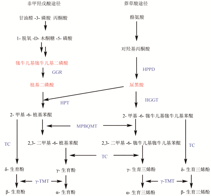 ... HGA在尿黑酸植基转移酶(homogentisate phytyltransferase,HPT)或尿黑酸牻牛儿基牻牛儿基转移酶(homogentisate geranylgeranyltransferase,HGGT)的催化下,与PDP或GGDP发生缩合,生成2-甲基-6-植基苯醌(2-methyl-6-phytylbenz-oquinone,MPBQ)或2-甲基-6-牻牛儿基牻牛儿基苯醌(2-methyl-6-geranylgeranylbenzoquinol,M-GGBQ).MPBQ或MGGBQ在2-甲基-6-植基苯醌甲基转移酶(2-methyl-6-phytylbenzoquinone methyltransferase,MPBQMT)作用下能够生成2,3-二甲基-6-植基苯醌(2,3-dimethyl-6-phytyl-l,4-benzoquinone,DMPBQ)或2,3-二甲基-6-牻牛儿基牻牛儿基苯醌(2,3-dimethyl-6-geranylg-eranylbenzoquinol,DMGGBQ).生育酚环化酶(tocopherol cyclase,TC)可以直接作用于MPBQ(MGGBQ),生成δ-生育酚(生育三烯酚),也可以催化DMPBQ(DMGGBQ)生成γ-生育酚(生育三烯酚).δ-生育酚(生育三烯酚)和γ-生育酚(生育三烯酚)在γ-生育酚甲基转移酶(γ-tocopherol methyltransferase,γ-TMT)作用下分别转换为β-生育酚和α-生育酚(生育三烯酚)[22,49](图5). ...