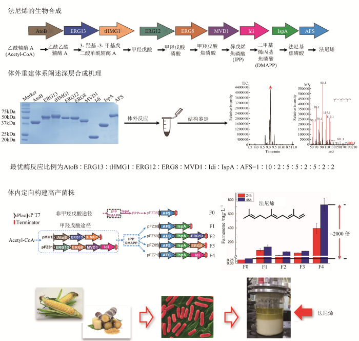 ... 武汉大学刘天罡团队[56-57]利用合成生物学手段发展了“定向合成代谢体系”,该体系通过体外重建体系将体内的目标途径元件在体外进行系统重新搭建,以此排除复杂体内代谢网络对目标研究途径的干扰,得到目标途径实际催化过程参数,获得该代谢途径效率最优情况下的酶催化比例,该技术能够快速得出途径调控的关键节点及参数.以此为指导,快速对大肠杆菌体内关键基因定向改造,即实现了在大肠杆菌中利用葡萄糖和甘油等廉价碳源发酵合成法尼烯分子,并基本实现1 kg葡萄糖合成0.2kg法尼烯的理论得率(图7),而作为分泌到胞外的油状法尼烯可以通过简易分离纯化获得.新技术的建立,使得法尼烯能够通过较低成本获得.该技术的发展为新技术的建立提供了契机.2014年武汉大学与能特科技合作,利用上述制备得到的生物基法尼烯作为前体,通过化学合成法的摸索,实现了法尼烯与乙酰乙酸酯在金属铑催化下缩合获得法尼基丙酮,再经还原和乙炔化生成异植物醇,仅3步反应即可实现以芳樟醇、二氢芳樟醇或柠檬醛为前体的7步合成反应(图8). ...