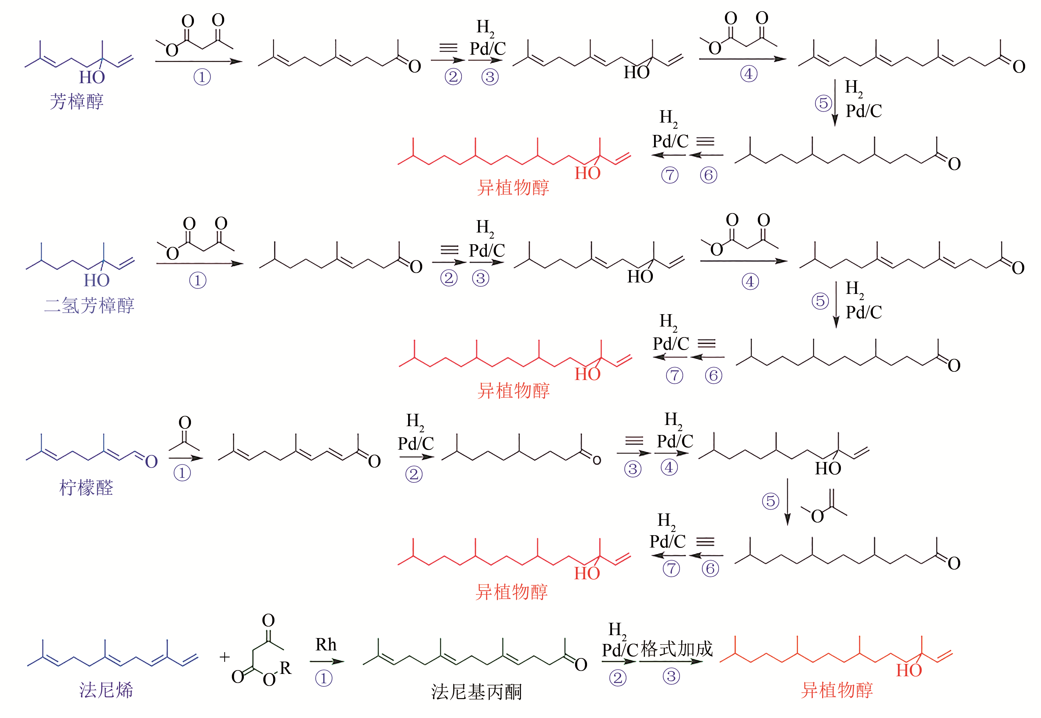 | 图8 以法尼烯为前体的3步合成反应和以芳樟醇和二氢芳樟醇或柠檬醛为前体的7步合成反应比较 |