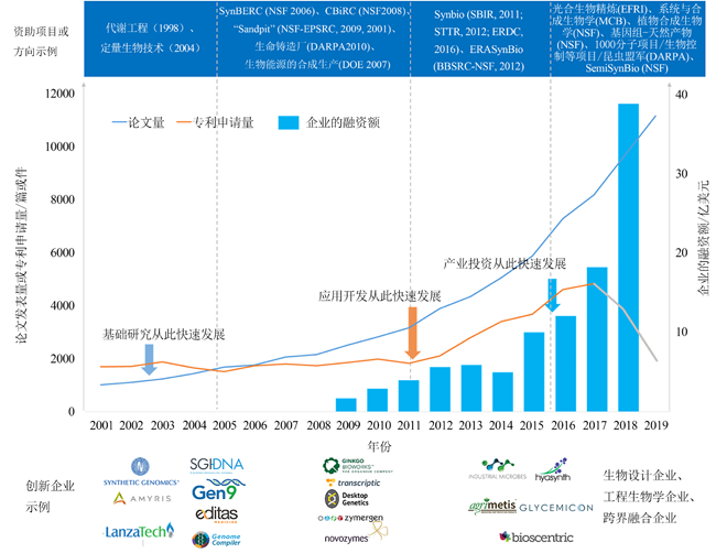 | 图 1 2001—2019年合成生物学的论文、专利和融资和企业发展情况 (1.论文检索的数据库为Web of Science,专利检索的数据库为incoPat,论文和专利的检索范围均为全球文献,论文和专利的检索日期为2020年1月21日;2.企业的融资额数据引用的是SynBioBeta的合成生物学企业融资数据(2009—2018)[ |