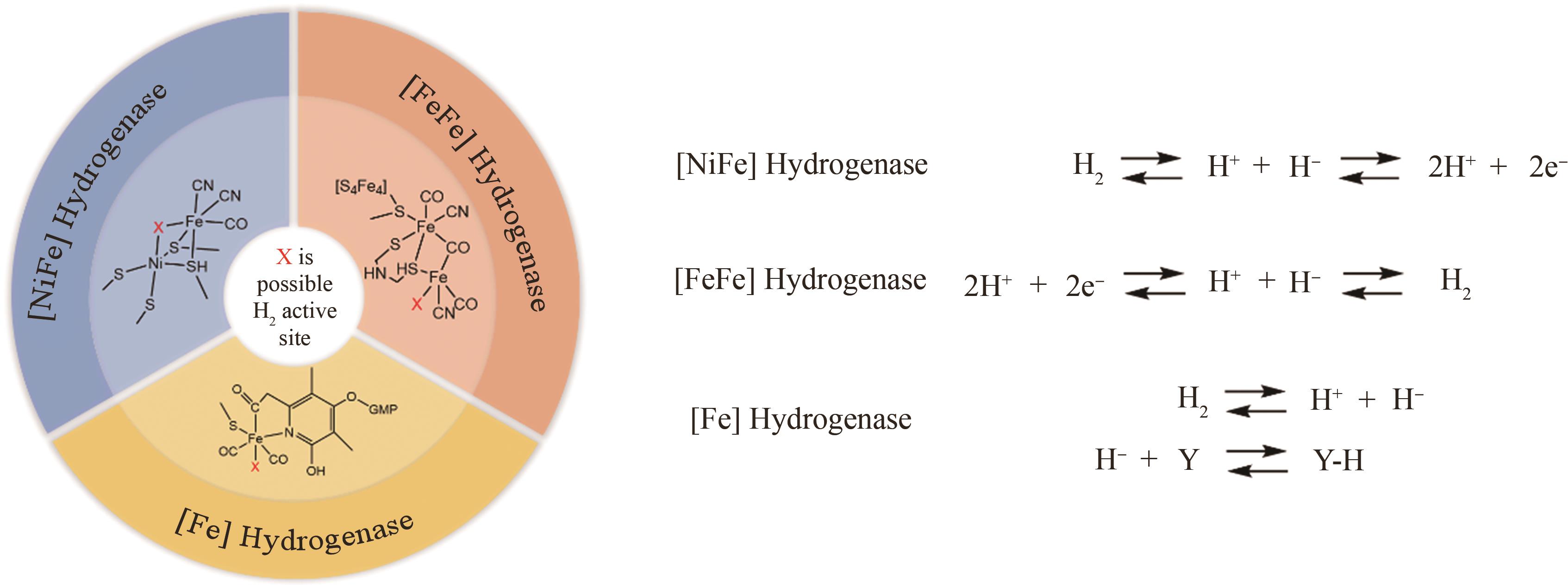 | Fig. 1 Active site and catalytic mechanism of [NiFe] hydrogenase, [FeFe] hydrogenase and [Fe] hydrogenase[ |